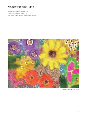 시에그린한국시화박물관 ㅣ 정우범 조선대학교 교육대학원 미술교육 전공 개인전 21회 / 초대전 및 단체전 다수 미국 갤러리 미셸의 전속작가, 한국미술협회 자문위원 환타지아 Arches에 小彩 50x35cm 2012 15