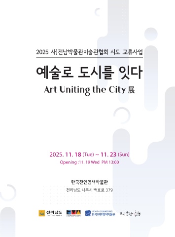 2025 사)전남박물관미술관협회 시도 교류사업 예술로 도시를 잇다 Art Uniting the City 展 2025. 11. 18 (Tue) ~ 11. 23 (Sun) Opening :11. 19 Wed PM 13:00 한국천연염색박물관 전라남도 나주시 백호로 379