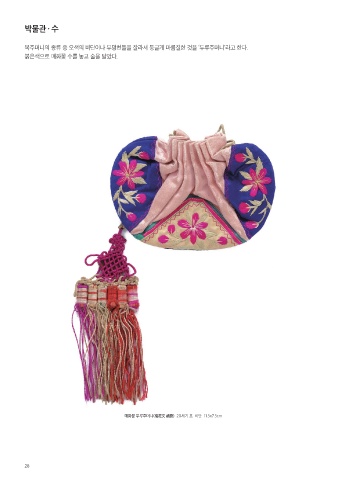 박물관 · 수 복주머니의 종류 중 오색의 비단이나 무명천들을 잘라서 둥글게 마름질한 것을 ‘두루주머니’라고 한다. 붉은색으로 매화꽃 수를 놓고 술을 달았다. 매화문 두루주머니(梅花文 福囊) 20세기 초 비단 11.5x7.5cm 28