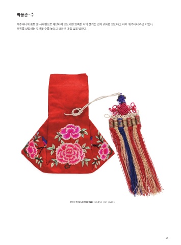 박물관 · 수 복주머니의 종류 중 사각형으로 재단하여 오므리면 뾰족한 각이 생기는 것이 귀처럼 보인다고 하여 ‘귀주머니’라고 하였다. 부귀를 상징하는 모란꽃 수를 놓았고 국화문 매듭 술을 달았다. 모란문 귀주머니(牧丹紋 福囊) 20세기초 비단 14x12cm 29
