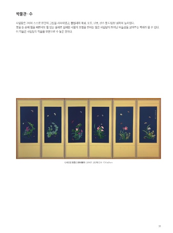 박물관 · 수 사임당은 7세에 스스로 안견의 그림을 사숙하였고, 풀벌레와 매화, 포도, 난초, 산수 등 다양한 화제에 능하였다. 붓을 든 손에 힘을 빼면서도 힘 있는 필세로 섬세한 사물의 표정을 전하는 일은 사임당의 뛰어난 예술성을 보여주는 백미라 할 수 있다. 이 작품은 사임당의 작품을 모본으로 수 놓은 것이다. 신사임당 초충도 모본(模本) 20세기 공단에 견사 각 61x31cm 33