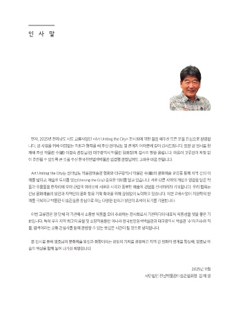 먼저, 2025년 전라남도 시도 교류사업인 <Art Uniting the City> 전시회에 귀한 걸음 해주신 모든 분을 진심으로 환영합