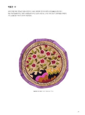 박물관 · 수 보라색 직물 위에 수를 놓은 원형 베갯모이다. 국화는 예로부터 장수와 번영의 선약(仙藥)을 상징하였다. 옛날 주유자(朱孺子)라는 사람이 국화를 달여 마시고 신선이 되었다는 고사도 이런 문양의 신비로움을 더해준다. 거치 문양을 둘러 ‘벽사’의 의미로 표현하였다. 화문(花文) 자수 베갯모 19세기 비단에 견사 17.5cm 39
