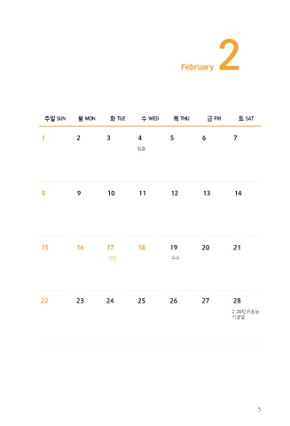 2 February 주일 SUN 월 MON 화 TUE 수 WED 목 THU 금 FRI 토 SAT 1 2 3 4 5 6 7 입춘 8 9 10 11 12 13 14 15 16 17 18 19 20 21 설날 우수 22 23 24 25 26 27 28 2.28민주운동 기념일 3