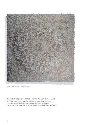 Untitled (Br225) 80x80x8cm Hanji & Mixed Media “한지를 태울 때 불은 단순한 도구가 아니라, 존재를 변환시키는 근원적 에너지로 작동한다. 불은 한지를 소멸시키지만, 그 재와 흔적 속에서 또 다른 형태의 생명을 태동시킨다. 그 잔열의 흔적은 시간의 층위이자, 내 내면의 에너지 파동을 시각화한 기록이다. 나는 불이라는 자연의 언어를 통해, ‘사라짐이 곧 생명으로 이어지는 순환의 원리’를 보여준다.” 18