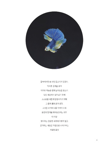 물속에서만 숨 쉬던 물고기가 있었다. 익숙한 경계를 넘어 미지의 하늘을 향해 날아오른 물고기 낯선 세상에서 살아남기 위해 스스로를 새롭게 탄생시키기 위해 그 몸에 뿔을 돋아 냈다. 그것은 과거의 나를 기꺼이 부숴 본연의 한계를 뛰어넘으려는 의지 더 이상 물이라는 안온한 세계에 머물지 않고 공기라는 새로운 차원으로 나아가려는 치열한 몸짓 25