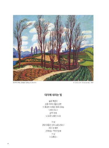 대지에 내리는 빛(light falling on etherth) 91.0x72.2cm Oil on canvas 1987 대지에 내리는 빛 삶과 죽음이 강을 이루는 팔당 강변 그 들판에 세워진 미루나무는 나목이 되고 군목 속에 나 또한 나목이 되네 그 날 팔당 강물은 신의 눈물 같았고 지친 내 영혼 건져내는 구원이었네 그 날 그 강물은~ 28