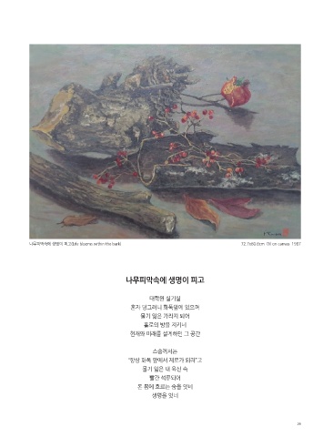나무피막속에 생명이 피고(Life blooms within the bark) 72.7x60.6cm Oil on canvas 1987 나무피막속에 생명이 피고 대학원 실기실 혼자 덩그러니 화폭앞에 있으며 물기 잃은 가라지 되어 홀로의 방을 지키네 현재와 미래를 설계하던 그 공간 스승께서는 “항상 화폭 앞에서 제로가 되라”고 물기 잃은 내 육신 속 빨간 석류되어 온 몸에 흐르는 숨을 잇네 생명을 잇네 29