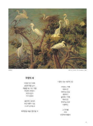 새(Bird) 145.5x112.0cm Oil on canvas 1982 우망의 새 사람이 사는 세상과 같은 우울을 잊기 위해 문경세재를 넘어 사랑하는 만큼 우울을 잊는다는 마을 태어나고 우망을 바라보니 태어나는 만큼 하얀 설산이 절망하고 거기 있었네 절망하는 만큼 죽어가고 설경이던 풍경은 죽어가는 만큼 하얀 새들이 사는 부활하는 소나무 숲이었네 그 진리를 하루종일 새들과 함께할 때 거기 우망에서 배웠네 37