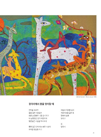 390.0x162.0cm Oil on canvas 1998 청덕리에서 봄을 맞이할 때 언덕을 오르면 아담과 이브를 싣고 뿔을 잃은 사슴들이 자유세상을 달리네. 슬픈 눈망울로 나를 응시하고 평화의 숲을 내 눈망울은 안개 마을되어 달리고 왕관잃은 사슴을 바라보네 또 뿔을 잃고 탄식하는 슬픈 사슴이 달리네 우아한 왕관을 쓰고 45