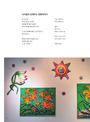나리꽃이 전해주는 생명이야기 눈 뜨는 봄 오늘 시들어도 뜨락 채우는 나리꽃 내일 살아나는 세상을 향기롭게 감싸는 녹색 머리칼 속의 붉은 보석 올해 죽어져도 나리는 미래를 향한 도전이 되기도~ 매해 또 살아나는 꿈이 되기도~ 나리가 내가 되어~ 죽었다 해마다 되살아 나는 내가 나리가 되어~ 위대한 힘을 지닌 그 꽃나리여라 태양아래서 ~ 78