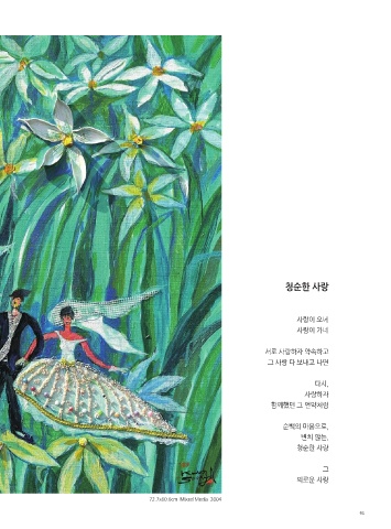 청순한 사랑 사랑이 오네 사랑이 가네 서로 사랑하자 약속하고 그 사랑 다 보내고 나면 다시, 사랑하자 함께했던 그 언약처럼 순백의 마음으로, 변치 않는, 청순한 사랑 그 의로운 사랑 72.7x60.6cm Mixed Media 2004 93