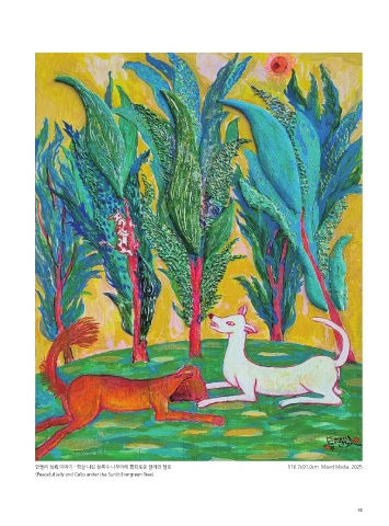 안젤리 성城 이야기 - 햇살 나린 상록수 나무아래 평화로운 젤라와 첼로 116.7x91.0cm Mixed Media 2025 (Peaceful Jelly and Cello under the Sunlit Evergreen Tree) 95