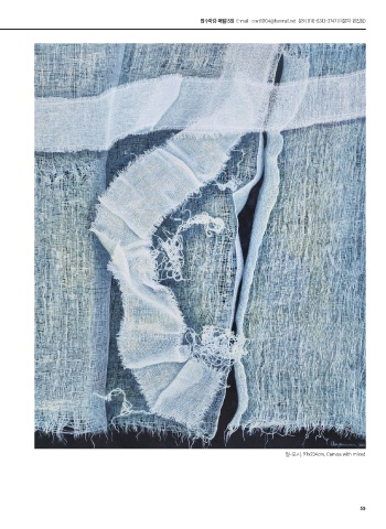 2 10-6313- t 문의 0 7 (이문자 편집장) 4 7 E 접수마감-매월15일 접수마감-매월15일 E-mail : crart1004@hanmail.net 문의 010-6313-2747 (이문자 편집장) -mail : cr t1004@hanmail.ne ar 얼-모시, 91x234cm, Canvas with mixed 59 59