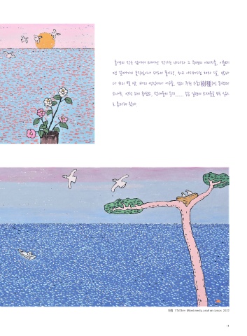 통영의 작은 섬에서 태어난 작가는 바다와 그 주변의 이미지들, 이를테 면 갈매기의 움직임이나 파도의 물이랑, 차고 이지러지는 해와 달, 밤바 다 위의 별 밭, 배의 생김새나 어구들, 섬의 주된 수종(樹種)인 동백과 소나무, 언덕 위의 흑염소, 텃새들의 둥지........ 등등 일련의 소재들을 모두 삶으 로 통과해 왔다. 아침 117x51cm Mixed media, pearl on canvas 2022 11
