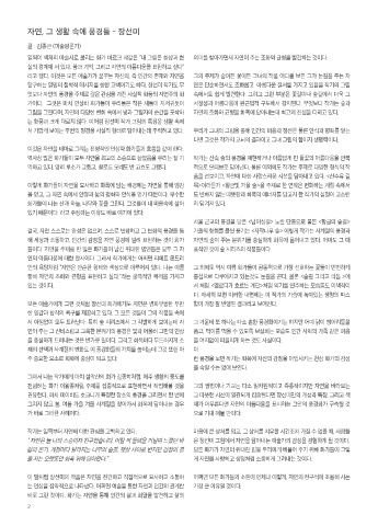 을 얻고, 그 자연 속에서 안정과 삶의 평화와 안식을 얻기 때문이다. 무수한 도 변하지 않는 따뜻함과 회복의 에너지를 담고자 한 작가의 심정이 고스란