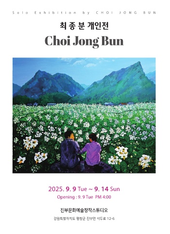 S ol o Exhi biti on b y CH OI JON G BUN 오른쪽 최 종 분 개인전 최 종 분 개인전 Choi Jong Bun 2025. 9. 9 Tue ~ 9. 14 Sun Opening : 9. 9 Tue PM 4:00 진부문화예술창작스튜디오 강원특별자치도 평창군 진부면 석두로 12-6