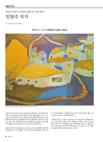 임현주 작가는 부산을 기반으로 활동하는 서양화가로, 따뜻한 색감과 편 다. 작가의 화면에는 부드럽게 왜곡된 건물과 생동감 넘치는 색채, 그리