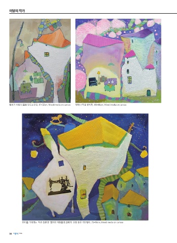 이달의 작가 말씨가 사람의 틀을 만드는군요, 41×32cm, Mixed media on canvas 언제나 지금 꽃피자, 46×46cm, Mixed media on canvas 우리를 기다리는 작은 창문과 염려와 재봉틀과 엄마가 오랫 동안 기다랗다, 73×61cm, Mixed media on canvas 30 30