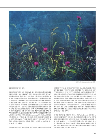 는 이를 압도한다. 작가는 이러한 비일상적 시선과 구도 속에서 과장된 색채 를 지켜온 생명체의 흔적이 응축된 존재론적 차원에서의 화려함이라 할 수 있