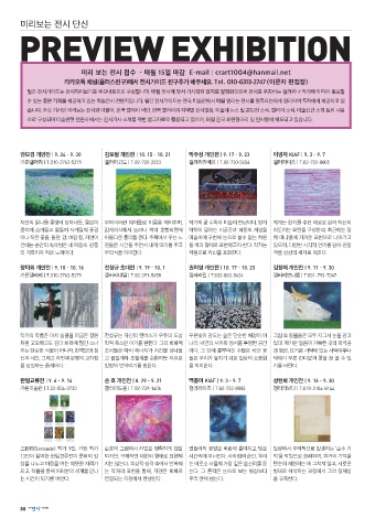 습니다. 주요 기사인 미리보는 전시와 더불어, 전국 갤러리 색인, 전국 갤러리의 지역별 전시일정, 미술계 뉴스 및 공모전 소식, 갤러리 소식, 미술신간 소개 등의 내용