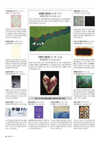 최영천 개인전 | 9. 10 – 9. 15 형상 회로전 | 8. 22 – 10. 26 박주은 초대전 | 6. 23 – 11. 3 이한 초대전 | 9. 15 – 9. 21