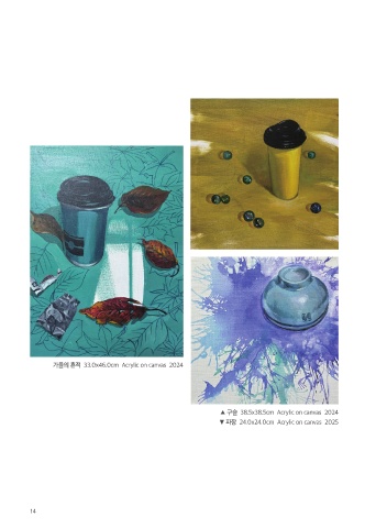 가을의 흔적 33.0x46.0cm Acrylic on canvas 2024 ▲ 구슬 38.5x38.5cm Acrylic on canvas 2024 ▼ 파장 24.0x24.0cm Acrylic on canvas 2025 14