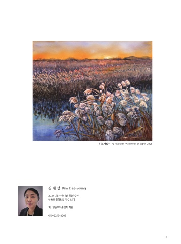 다대포 해넘이 72.7x90.9cm Watercolor on paper 2025 김 대 성 Kim, Dae-Soung 2024 여성미술대전 특선 수상 영등포 문화원전 다수 참여 現 : 영등포미술협회 회원 010-2243-3203 19