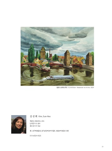5월의 스트라스부르 72.7x90.9cm Watercolor on Arches 2024 김 선 희 Kim, Sun-Hee 개인전 2회(2014, 216) 단체전 다수 참여 공모전 다수 입상 現 : 한국미술협회, 한국전업미술작가협회, 영등포미술협회 회원 010-4529-0525 23