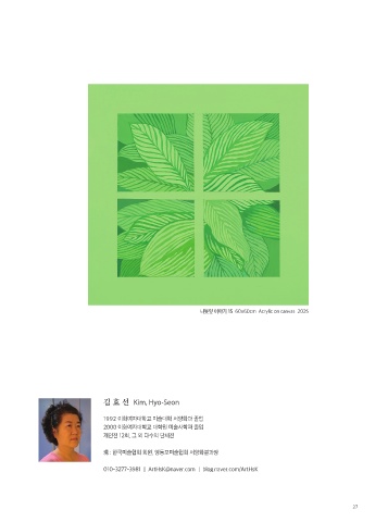 나뭇잎 이야기 15 60x60cm Acrylic on canvas 2025 김 효 선 Kim, Hyo-Seon 1992 이화여자대학교 미술대학 서양화과 졸업 2000 이화여자대학교 대학원 미술사학과 졸업 개인전 12회, 그 외 다수의 단체전 現 : 한국미술협회 회원, 영등포미술협회 서양화분과장 010-3277-3981 ㅣ ArtHsK@naver.com ㅣ blog.naver.com/ArtHsK 27