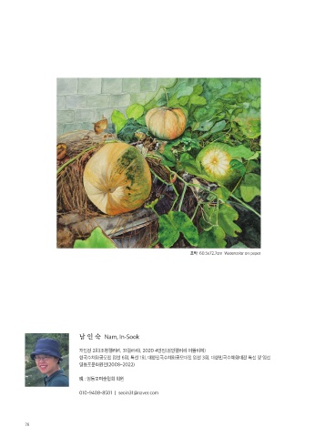 호박 60.5x72.7cm Watercolor on paper 남 인 숙 Nam, In-Sook 개인전 2회(조형갤러리, 31갤러리), 2020 4인전(경인갤러리 아뜰리에) 한국수채화공모전 입선 6회, 특선 1회, 대한민국수채화공모대전 입선 3회, 대한민국수채화대전 특선 및 입선 영등포문화원전(2008~2022) 現 : 영등포미술협회 회원 010-9408-8501 ㅣ seoin31@naver.com 28
