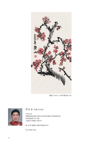 가을꽃 35x45cm 한지에 먹물 담채 2025 박 유 섭 Park, U-Sub 개인전 2회 전통미술대전 통일부장관상, 제32회 대한민국 미술대전 특선 한국미술협회 이사 역임 대한민국서예협회 초대작가 現 : 한국미술협회, 영등포미술협회 감사 010-5480-9532 34