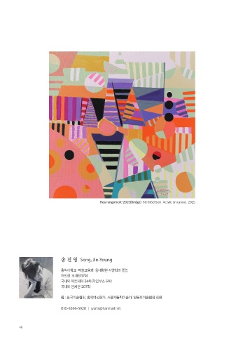 Rearrangement-2025(Bridge) 60.6x60.6cm Acrylic on canvas 2025 송 진 영 Song, Jin-Young 홍익대학교 미술교육과. 동대학원 서양화과 졸업 개인전·초대전37회 국내외 아트페어 24회(개인부스 6회) 국내외 단체전 207회 現 : 한국미술협회, 홍익여성화가, 서울가톨릭미술가, 영등포미술협회 회원 010-3366-5920 ㅣ jyarts@hanmail.net 40