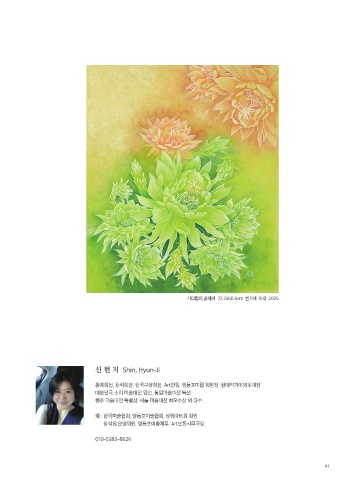 기다림의 끝에서 72.7x60.6cm 한지에 채색 2025 신 현 지 Shin, Hyun-Ji 홍예회전, 창석회전, 한국구상회전, Art안동, 영등포미협 회원전, 현대작가야외초대전 대한민국 소치 미술대전 입선, 통일미술대전 특선 행주 미술대전 특별상, 새늘 미술대전 최우수상 외 다수 現 : 한국미술협회, 영등포미술협회, 상록아트회 회원 창석회 운영위원, 영등포예총재무, Art안동사무국장 010-5383-8629 41