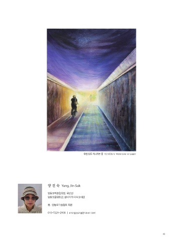 우린 모두 지나가는 중 72.7x53cm Watercolor on paper 양 진 숙 Yang, Jin-Suk 영등포미술협회전, 목련전 영등포문화원전, 현대작가 야외초대전 現 : 영등포미술협회 회원 010-7229-2958 ㅣ energyyang@naver.com 43