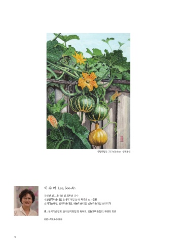 주렁주렁 2 72.7x60.6cm 수묵채색 이 수 아 Lee, Soo-Ah 개인전 2회, 초대전 및 회원전 다수 대한민국미술대전 초대작가 및 심사, 목우회 심사위원 소치미술대전, 행주미술대전, 새늘미술대전, 남농미술대전 초대작가 現 : 한국미술협회, 현대한국화협회, 목우회, 영등포미술협회, 유정회 회원 010-7163-0989 48