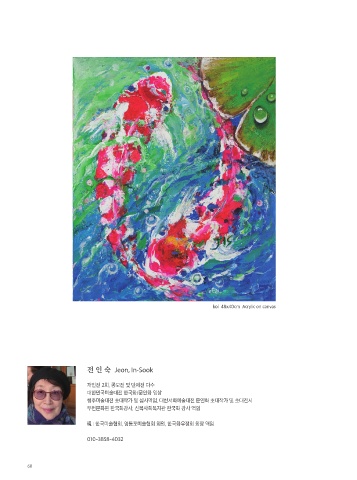 koi 48x40cm Acrylic on canvas 전 인 숙 Jeon, In-Sook 개인전 2회, 공모전 및 단체전 다수 대한민국미술대전 한국화/문인화 입상 행주미술대전 초대작가 및 심사역임, 대한서화예술대전 문인화 초대작가 및 초대전시 부천문화원 한국화강사, 신목사회복지관 한국화 강사 역임 現 : 한국미술협회, 영등포미술협회 회원, 한국화유정회 회장 역임 010-3858-4032 60
