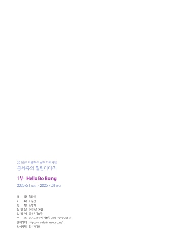 2025년 박물관·미술관 지원사업 콩세유의 힐링이야기 1부 Hello Bo Bong 총 괄 : 정미애 기 획 : 이용진 진 행 : 김명지 발 행 일 : 2025년 06월 발 행 처 : 콩세유미술관 주 소 : 경기도 파주시 세류길7(031-949-0654) 홈페이지 : http://conseilartmuseum.org/ 인쇄제작 : 전시가이드