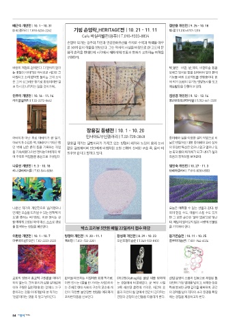 이환준 개인전 | 10. 1 – 10. 7 방정아 개인전 | 9. 20 – 11. 1 장성재 개인전 | 8. 29 – 10. 23 듣기연습전 | 10. 11 – 10. 25