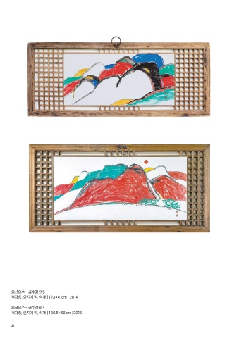 요산요수 – 금수강산 5 격자창, 한지에 먹, 석채 | 123×41cm | 2014 요산요수 – 금수강산 4 격자창, 한지에 먹, 석채 | 136.5×66cm | 2016 21