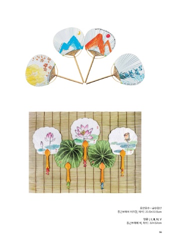 요산요수 – 금수강산 둥근부채에 아크릴, 채색 | 22.5×22.5cm 연꽃 I, II, III, IV, V 둥근부채에 먹, 채색 | 32×32cm 56