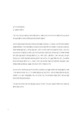 그의 삶의 하이라이트가 될 이번 개인전을 진심으로 축복하며, 그의 남은 시간들이 주께서 주시는 평강으로