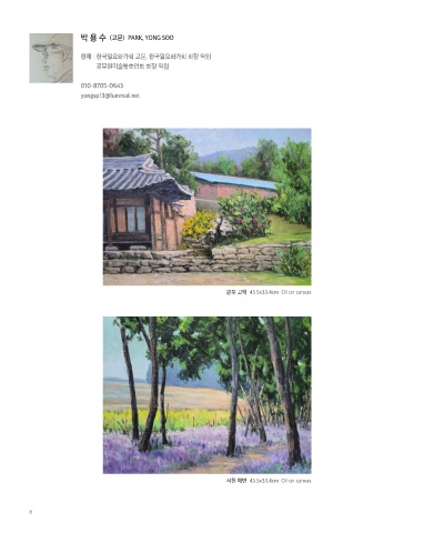 박 용 수 (고문) PARK, YONG SOO 현재 : 한국일요화가회 고문, 한국일요화가회 회장 역임 공무원미술동호인회 회장 역임 010-8705-0643 yongsp13@hanmail.net 군포 고택 45.5x33.4cm Oil on canvas 서천 해변 45.5x33.4cm Oil on canvas 8