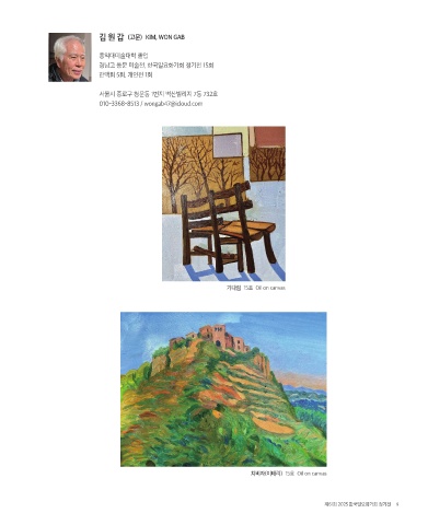 김 원 갑 (고문) KIM, WON GAB 홍익대미술대학 졸업 경남고 동문 미술전, 한국일요화가회 정기전 15회 한맥회 5회, 개인전 1회 서울시 종로구 청운동 1번지 벽산빌리지 7동 732호 010-3368-8513 / wongab47@icloud.com 기다림 15호 Oil on canvas 치비자(이태리) 15호 Oil on canvas 제61회 2025 한국일요화가회 정기전 9