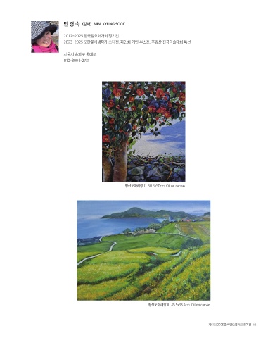 민 경 숙 (감사) MIN, KYUNG SOOK 2012~2025 한국일요화가회 정기전 2023~2025 모란꽃사생작가 초대전, 파인회 개인 부스전, 주왕산 전국미술대회 특선 서울시 송파구 중대로 010-8994-2731 청산도아리랑Ⅰ 60.6x50cm Oil on canvas 청산도아리랑Ⅱ 45.5x33.4cm Oil on canvas 제61회 2025 한국일요화가회 정기전 13