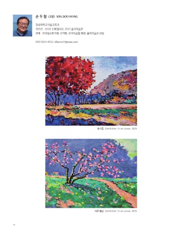 손 두 형 (고문) SON, DOO HYUNG 경희대학교미술교육과 개인전 : 2020 조형갤러리, 2022 을지미술관 현재 : 한국일요화가회, 한맥회, 한국미술협 회원, 을지미술관 관장 010-5341-4172 / dhsom77@nate.com 늦가을 53x40.9cm Oil on canvas 2025 이른 봄날 53x40.9cm Oil on canvas 2025 14