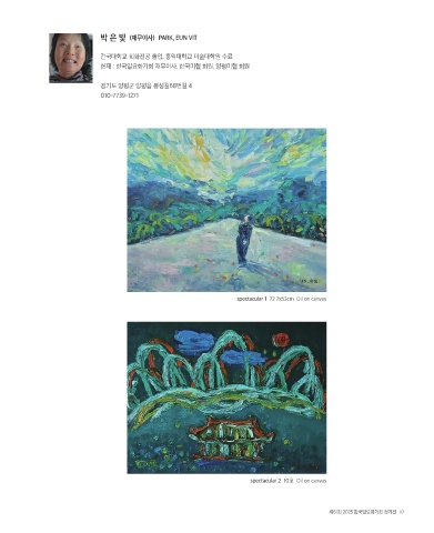 박 은 빛 (재무이사) PARK, EUN VIT 건국대학교 회화전공 졸업, 홍익대학교 미술대학원 수료 현재 : 한국일요화가회 재무이사, 한국미협 회원, 양평미협 회원 경기도 양평군 양평읍 봉성길68번길 4 010-7739-1271 spectacular 1 72.7x53cm Oil on canvas spectacular 2 10호 Oil on canvas 제61회 2025 한국일요화가회 정기전 17