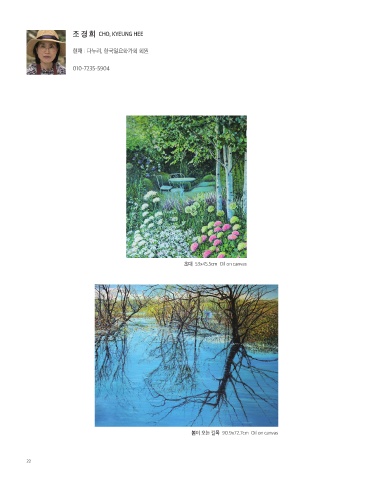 조 경 희 CHO, KYEUNG HEE 현재 : 다누리, 한국일요화가회 회원 010-7235-5904 초대 53x45.5cm Oil on canvas 봄이 오는 길목 90.9x72.7cm Oil on canvas 22