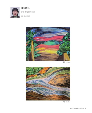강 숙 정 K.S.J 현재 : 한국일요화가회 회원 010-8241-9328 황혼 60x45cm 역동 45x30cm 제61회 2025 한국일요화가회 정기전 29
