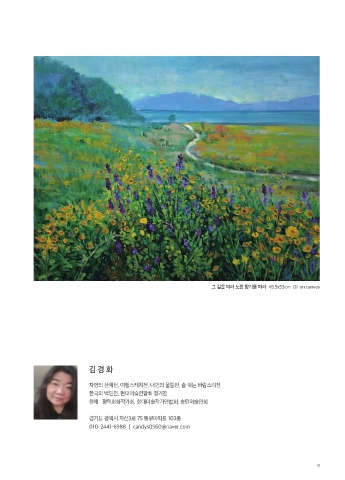 그 길을 따라 노란 향기를 따라 45.5x53cm Oil on canvas 김 경 화 자연의 산책전, 여행스케치전, 내면의 울림전, 숨 쉬는 바람소리전 한국의 백인전, 현대미술연합회 정기전 현재 : 평택회화작가회, 현대미술작가연합회, 송탄미술인회 경기도 평택시 지산3로 75 동부아파트 103동 010-2441-6988 ㅣ candys0560@naver.com 9